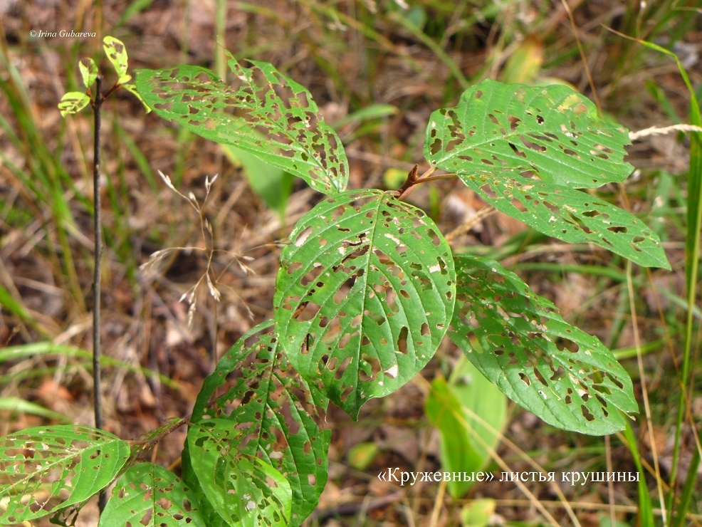Иногда необычное изменение в морфологии органов растений вызывает не только интерес, но и желание непременно выяснить причину такого явления. В осенний период, когда вокруг не остается ярких цветущих видов, взгляд фокусируется на деталях или на чем-то непривычном. В сентябре – октябре по лесным полянам и опушкам можно наблюдать еще зеленые или уже пожелтевшие листочки небольших кустиков крушины, у которых мякоть листа аккуратно «вырезана» вдоль жилок и от этого листья кажутся кружевными. В чем причина и кто постарался так художественно поработать с листьями? Начать следует с того, что крушина – это кустарник или небольшое деревце, которое можно встретить почти на всем протяжении Куршской косы в хвойных и смешанных лесах. Чаще всего крушина ольховидная или ломкая (Frangula alnus) встречается в подлеске, под пологом старых елей, сосен, с примесью ольхи и липы, на более-менее увлажненной почве. Цветет она в мае – начале июня беловато-зелеными, невзрачными цветами, которые трудно рассмотре