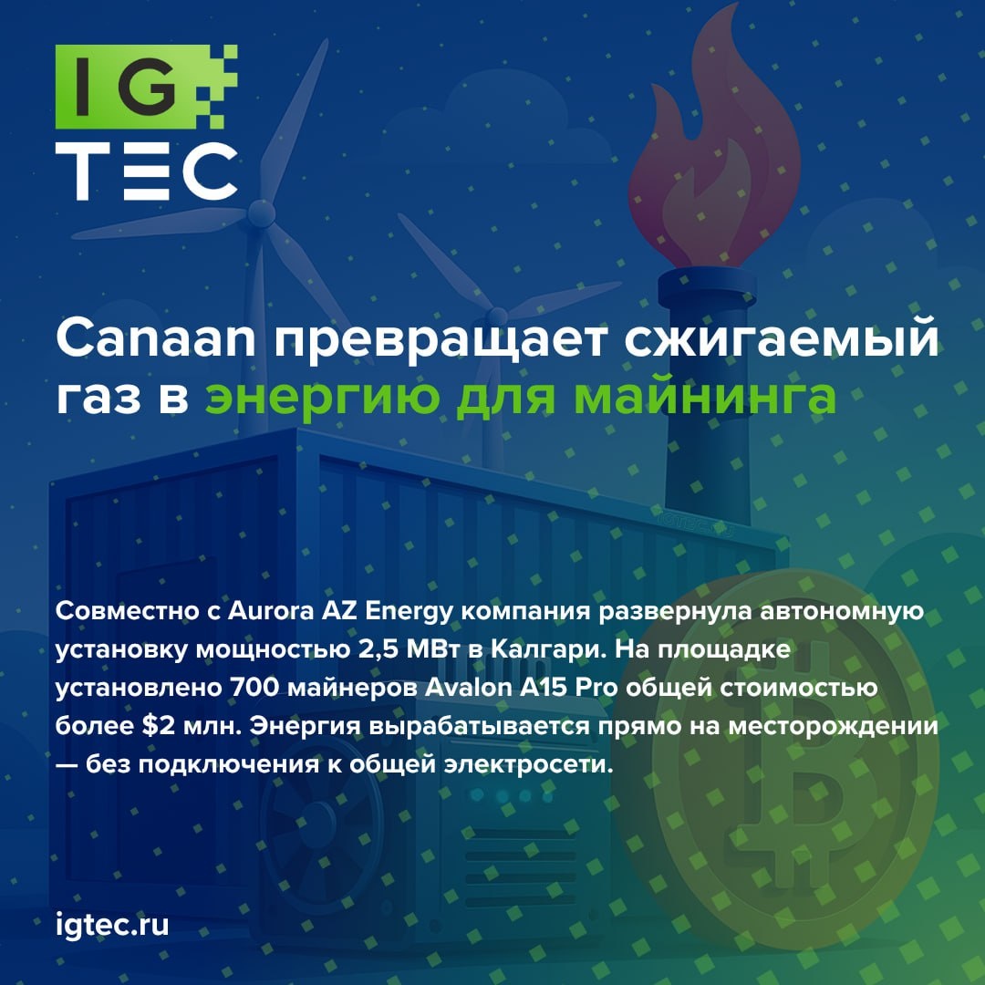 💨⚡️Canaan превращает сжигаемый газ в энергию для майнинга Canaan запустила пилотный проект в Канаде, где электроэнергия для майнинга будет вырабатываться из сжигаемого природного газа. ⛏️Совместно с Aurora AZ Energy компания развернула автономную установку мощностью 2,5 МВт в Калгари. На площадке установлено 700 майнеров Avalon A15 Pro общей стоимостью более $2 млн. Энергия вырабатывается прямо на месторождении — без подключения к общей электросети. 🔋Такое решение позволяет использовать «застрявший» газ, который обычно просто сжигается в факелах, снижая выбросы CO2 на 12–14 тыс. тонн в год. 📊Canaan отмечает, что установка работает с 90% аптаймом и обеспечивает себестоимость электроэнергии значительно ниже рыночной. Проект стал частью стратегии компании по развитию собственной инфраструктуры: на конец сентября хешрейт Canaan достиг 9,3 EH/s. 📈Акции Canaan после анонса выросли почти на 40%. В компании также сообщили, что планируют масштабировать такую модель в регионах с избытко