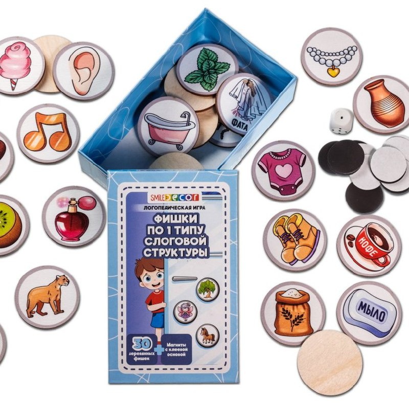 👅 Новинка для логопеда: деревянные фишки на слоговую структуру. На каждый тип слоговой структуры свой набор фишек. СОСТАВ ИГРЫ: 🔸 30 деревянных фишек; 🔸 игральный кубик; 🔸 30 магнитов с клеевой основой; 🔸 картонная коробка для хранения. Диаметр фишек: 4,5 см КАК ИГРАТЬ? 1. Игра «Знакомство». Разложите перед ребёнком несколько фишек (начните с 5-7). Чётко назовите каждое слово, выделяя голосом гласные звуки и ритмический рисунок слова, например: ВО-ДА, НО-ГА. Попросите ребёнка показать названный вами предмет. 2. Игра «Повторяй-ка!». Произнесите слово, отхлопайте его по слогам вместе с ребёнком: ВА-ТА – два хлопка. 3. Игра «Что изменилось?» 4. Игра «Классификация»: съедобное-несъедобное, живое-неживое. 5. Игра «Четвёртый лишний» Больше идей игр на нашем сайте. 👍 Цена за любой один набор: 510 руб. 🙋Нужна помощь в подборе игр или оформлении заказа? Напишите в личку @igrocity_manager ⏩ Заказывайте в Игросити: https://www.igrocity.ru/podborka.php?kod=177657&utm_source=tg&utm_medi