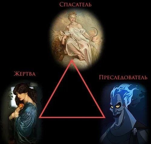 🔻 Треугольник Карпмана 🔻 Как и планировала в предыдущих статьях, предлагаю немного разобрать такую модель созависимых отношений, как ,,Треугольник Карпмана,, на примере известного сериала. 🔻 Треугольник Карпмана ( иногда его ещё называют драматическим треугольником) — психологическая модель зависимых отношений, разработанная американским психиатром Стивеном Карпманом, довольно часто используемая в методике Транзактного анализа в психологии. Описывает систему деструктивных отношений, в которой участники бессознательно принимают одну из трёх ролей: спасатель, жертва, преследователь. 🔺Это не фиксированные личностные характеристики, а модели поведения, которые некоторые используют в определенных жизненных ситуациях. Причем участники драматического треугольника периодически меняются ролями, в зависимости от обстоятельств: жертва вдруг превращается в преследователя, а преследователь в жертву. 🔺 В Драматическом Треугольнике должны быть, как минимум два участника, а также и более.