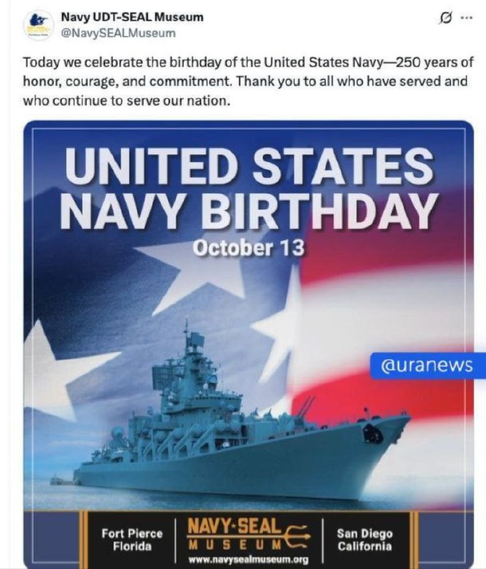 Мне это нравится)) Вчера музей морских котиков США разместил снимок российского крейсера «Варяг» на коллаже в честь 250-летия американского флота: Сегодня мы празднуем день рождения Военно-морских сил — 250 лет отваги, храбрости и верности. Спасибо всем, кто служил и продолжает служить нашему народу. Ну нравятся американцам наши корабли. Что поделать? Не в первый раз такое. В 2023 году конгрессмен Кори Миллс в соцсети X поздравил американских моряков, приложив к твиту изображение российского корабля. Поздравляю с 248 годовщиной основания американского флота, <...> защищающего наши моря и нашу свободу подписал он фото, на котором изображен флагман Северного флота ВМФ России, тяжелый атомный ракетный крейсер «Петр Великий».