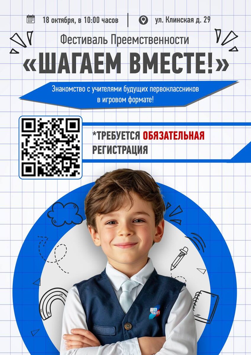 🧑 «Шагаем Вместе» — приглашаем на Фестиваль преемственности! Дорогие родители будущих первоклассников! Приглашаем вас и ваших детей на увлекательный фестиваль преемственности «Шагаем Вместе», который состоится в субботу, 18 октября, в 10:00 по адресу: ул. Клинская, д. 29. 💫 Мероприятие пройдет в формате игры по станциям, оно будет интересным и полезным для всех участников. Вас ждут разнообразные активности и задания, которые помогут вашему ребенку лучше адаптироваться к школе и подготовиться к новому учебному году. У вас также будет возможность задать вопросы и получить советы от опытных педагогов. ✔️ Не забудьте зарегистрироваться по ссылке. Ждем вас на нашем фестивале! Пусть этот день станет незабываемым и полезным для всей семьи! #ДОНМ #ШколыКолледжиМосквы #Школа1474 #ШагаемВместе