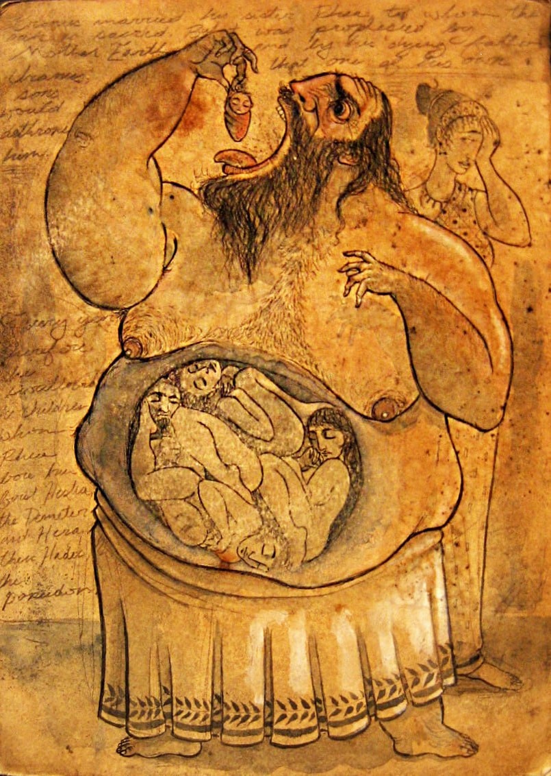 Кронос: когда страх съедает будущее Сегодня в рубрике "Мифологический понедельник" я подготовила для Вас историю начала Мифов об Олимпийских Богах. Миф совершенно небольшой, но очень и очень глубокий. В конце покажу как идея и "мораль" этой истории глубоко проросла в современную мировую культуру. Итак, поехали: От союза Земли (Геи) и Неба (Урана) родились древние боги - титаны. Среди них Кронос и его сестра-супруга Рея. По просьбе матери Кронос орудием-серпом низвергает отца, воцаряется на престол и открывает время тишины и достатка, которое потом греки назовут "золотым веком". Но Кронос услышал пророчество: его свергнет собственный сын. Из страха Кронос стал глотать всех новорождённых детей Реи: Гестию, Деметру, Геру, Аида, Посейдона. Когда родился Зевс, Рея спрятала его на Крите, а Кроносу подсунула камень, завернутый как младенец. Зевс вырастает, возвращается "домой" и заставляет отца вернуть своих проглоченных братьев и сестер. Начала война титанов и олимпийцев, долгая и кровоп