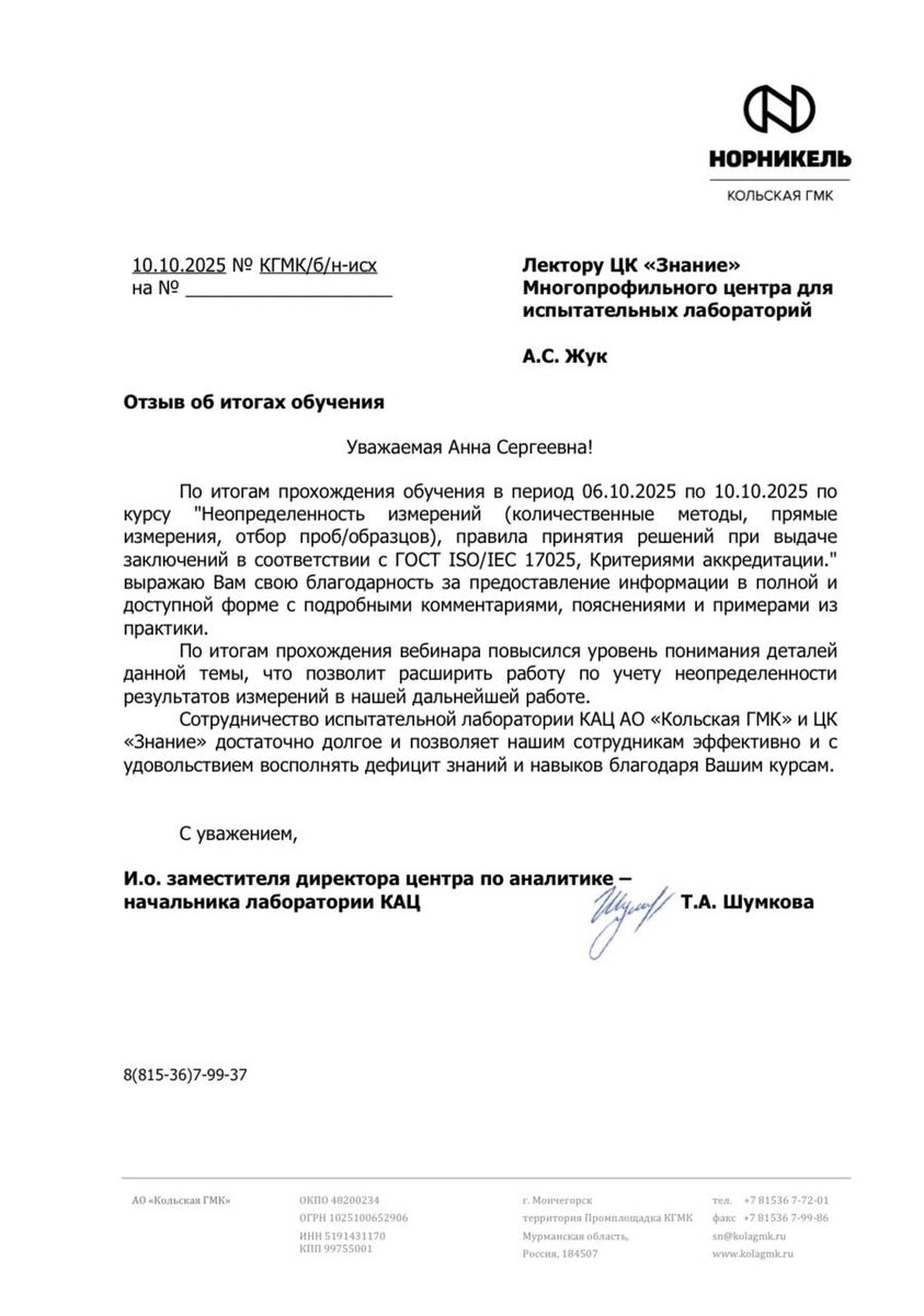 Отзыв по результатам обучения на курсе № 7 "Неопределенность измерений (количественные методы, прямые измерения, отбор проб/образцов), правила принятия решений при выдаче заключений в соответствии с ГОСТ ISO/IEC 17025, Критериями аккредитации." Благодарим, что выбираете нас! 🍀