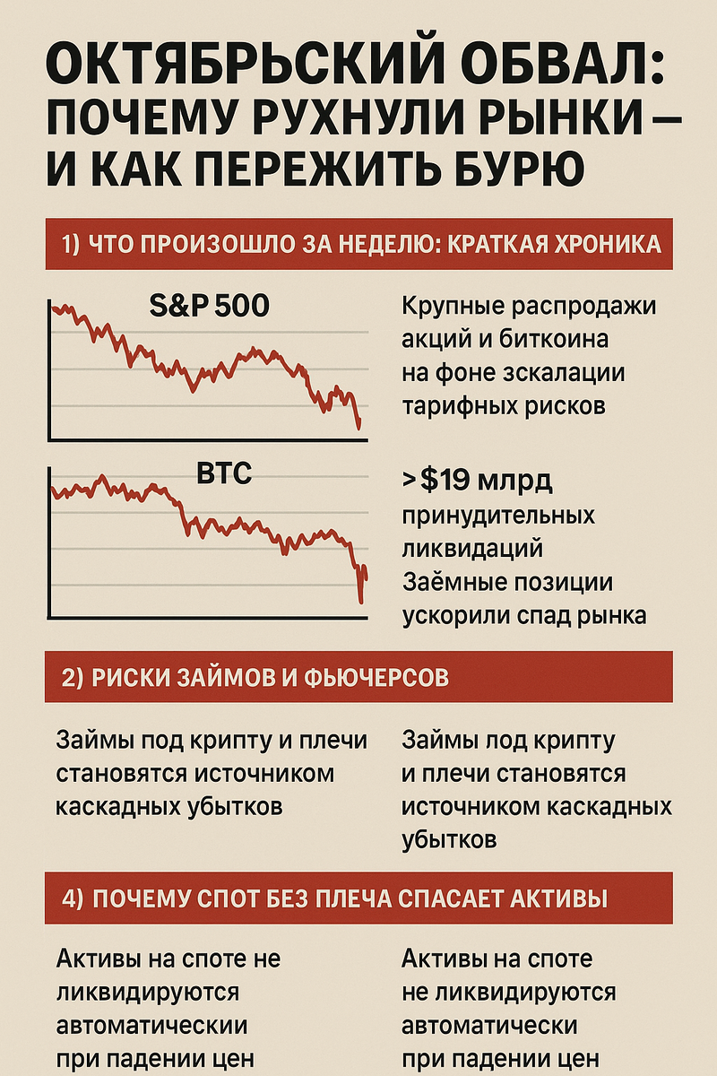 За последнюю неделю октября рынки тряхнуло: сначала — рекордное падение и ликвидации с плечом в крипте (≈$19 млрд за сутки), затем — отскок и в акциях, и в BTC. Триггер — резкая эскалация торговых рисков США–Китай (объявление о 100% тарифах), дефицит ликвидности и переизбыток кредитного плеча. Вывод: кредиты под крипту и фьючерсы — источник каскадных убытков; «тихая гавань» — спотовые активы без плеча и без залога. (Reuters) Вечерние заявления о 100% тарифах на китайский импорт и возможных экспортных ограничениях по ПО спровоцировали синхронный удар по рисковым активам. Любая «жёсткая» новость теперь мгновенно проходит по тонким ликвидным лентам и бьёт именно там, где много плеча. (Reuters) Криптобиржи давно живут на высоких мультипликаторах риска: маржинальные займы, фьючерсы с 10х–50х, залог под альткоины. Когда цена падает на несколько процентов, автоматы начинают ликвидировать залоги, усугубляя падение и запуска́я цепочку продаж. Именно так и набегает рекордный объём ликвидаций — $