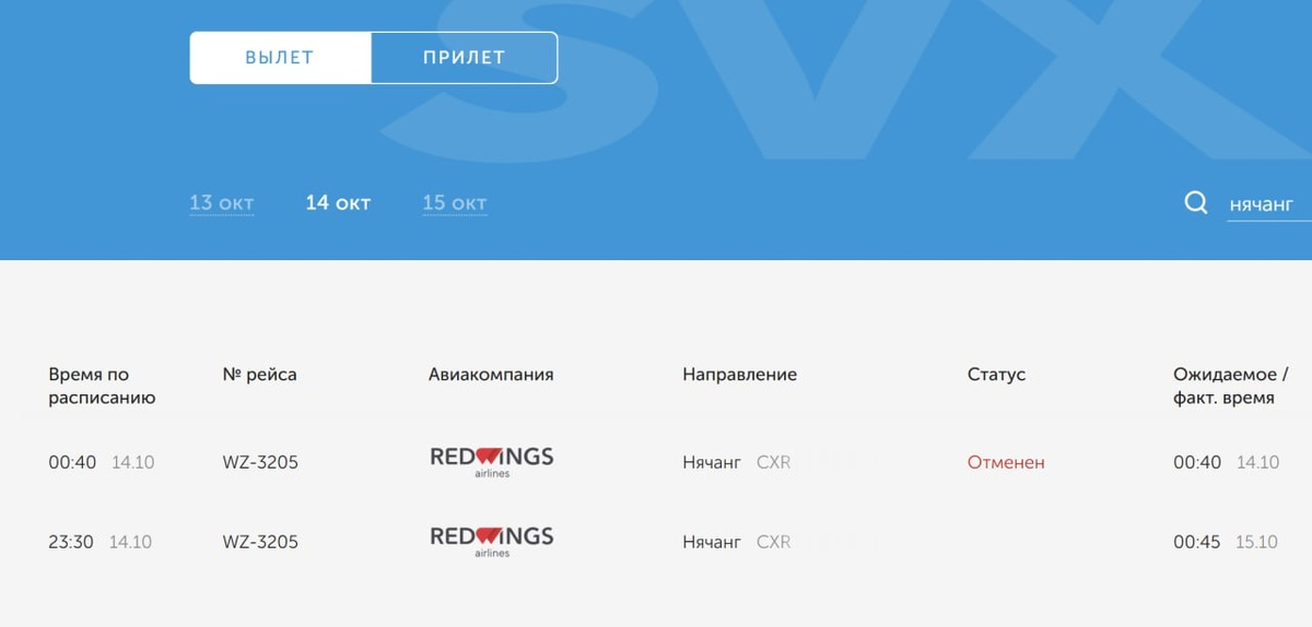 В ответ на пост Продолжаются задержки рейсов в Нячанг у авиакомпании Red Wings, после того как Boeing 777 из-за технической неисправности застрял в аэропорту Камрани 10 октября. Расписание еще не пришло в норму, хотя перевозчик постепенно его выравнивает. Кстати, пассажиры, которые не смогли улететь тем самым бортом RA-73329, еще возвращаются в Москву. Двое из них прилетят сегодня рейсом «Аэрофлота». Как рассказал Крыше их знакомый, авиакомпания оплатила проживание в 5* отеле. Что касается задержек сегодняшних рейсов: вылет из Екатеринбурга в Нячанг откладывается на 24 часа, вместо 00:40 он отправится в 00:45, но 15 октября. Борт, который должен был забрать туристов из Кольцово, опаздывает с прибытием из Вьетнама на сутки. А вот рейс из Москвы перенесли всего на полтора часа. На вьетнамский курорт пассажиров доставил другой боинг авиакомпании, прибывший с Пхукета. Подробнее написали на ТурДоме. @tourdom