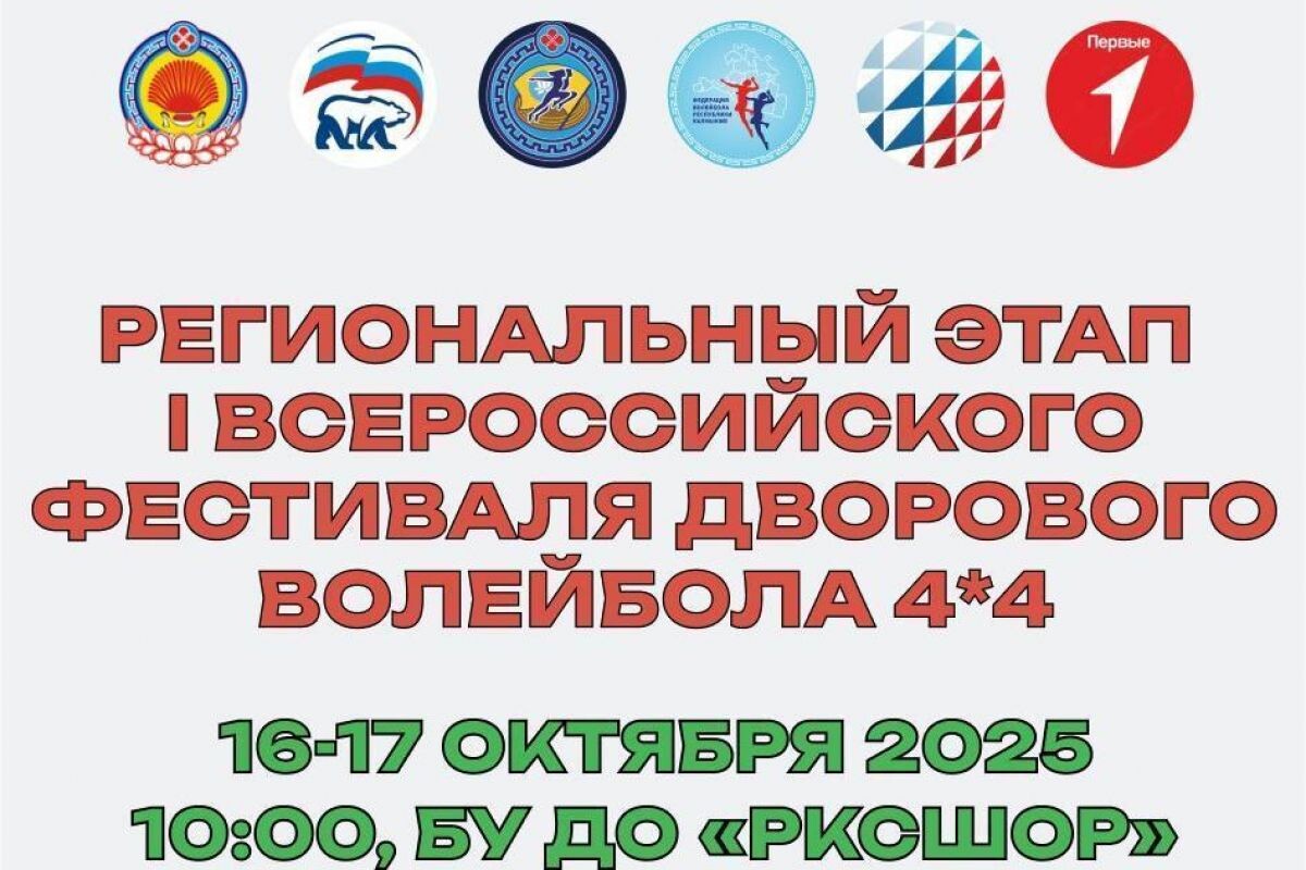 В Элисте пройдет региональный этап I Всероссийского фестиваля дворового волейбола 4х4 14 октября 2025, 12:13 I Всероссийский фестиваль детского дворового волейбола 4х4 выходит на финишную прямую! Региональный этап соревнований пройдет в Элисте с 16 по 17 октября. Начало в 10:00 на базе БУ РК "РКСШОР" ("Дворец спорта им. Калдарикова Н.М." ул. С.М. Буденного, 5) В этапе примут участие 16 команд - представители 13 районов и 3 команды из г. Элисты! Именно региональный этап определит состав сборной Республики Калмыкии для поездки в Москву на Всероссийский финал турнира, который запланирован с 5 по 8 ноября. Приглашаем всех жителей и гостей Элисты поддержать юных спортсменов. Мероприятие обещает быть зрелищным и динамичным. Вход на соревнования свободный для всех желающих. #ЕР #ЕР08 #Калмыкия #ДетскийСпорт