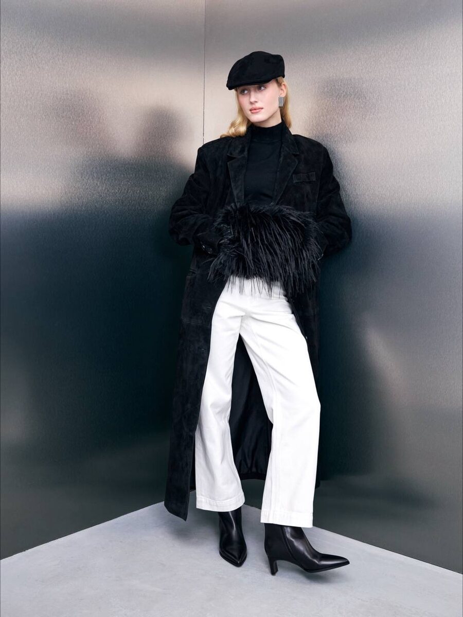 Гармонично дополняя разнообразие фактур черного: замши в пальто, гладкого трикотажа на топе и пушистой у сумки-муфты.