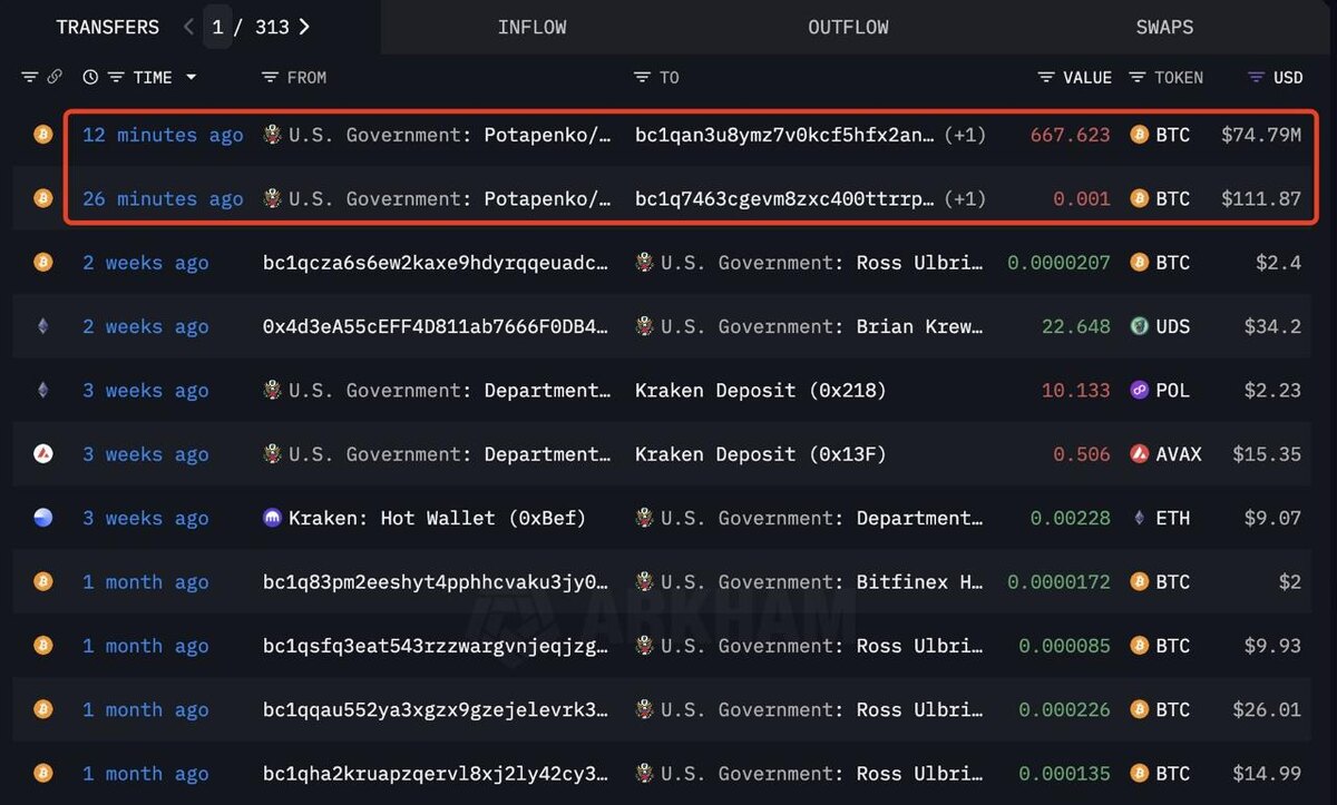 🇺🇸 Правительство США перевело 667,6 BTC(74.79m) на новый окшелек – Arkham