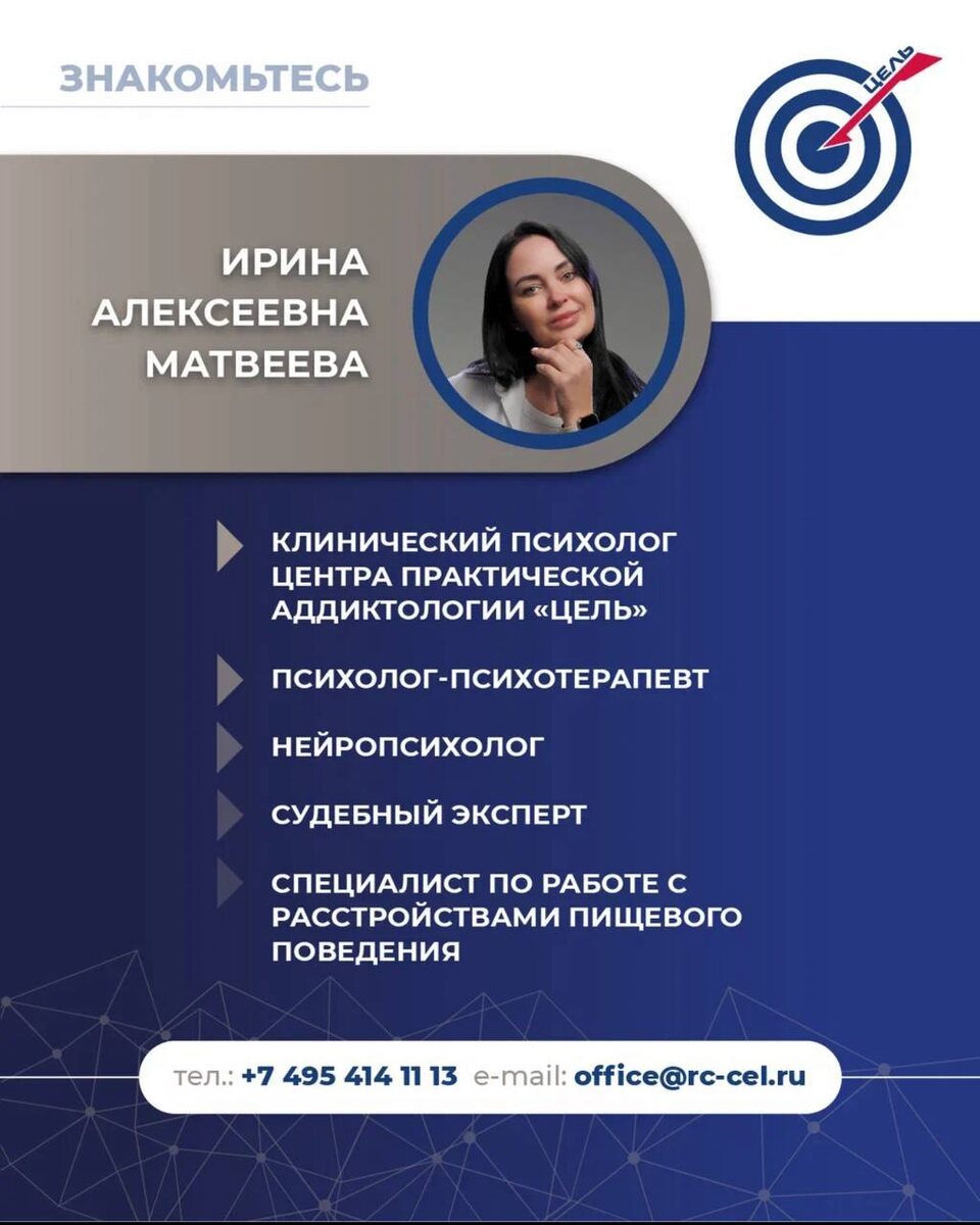 Ирина Алексеевна — клинический психолог, нейропсихолог, судебный эксперт, психолог-психотерапевт и гипнотерапевт с большим опытом работы. Она также является специалистом по работе с расстройствами пищевого поведения и обладает глубокими знаниями и практическими навыками в этой области.