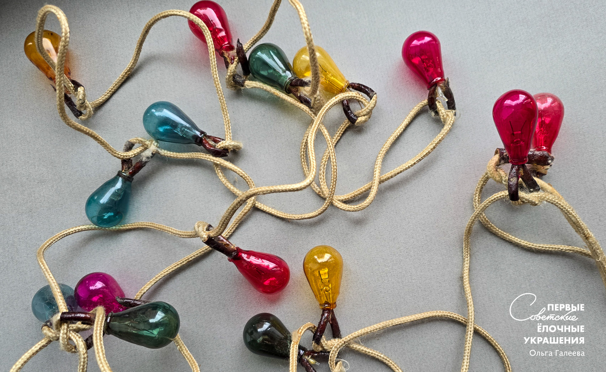 В общем, нашла я очередной клад - огромную пыльную коробку с кучей перепутаных проводов и разноцветных лампочек. Продавец был рад тому, что я избавила его от этого хлама ))) В коробке оказались самые ранние советские электрогирлянды, причем, в достойнойм состоянии. Смотрите ) Электрогирлянда из 20 лампочек, окрашеных в разные цвета, на шелковом шнуре (у моей лампочек поменьше). Вот похожая гирлянда в прейкуранте 1937 года. Еще одна гирлянда. В прейскуранте 1941 года было описание - гирлянда из 10 автомобильных ламп на звонковом проводе. Количество ламп не совпадает, но провод тот ) Эта гирлянда, похоже, была на 20 лампочек. Лампочки автомобильные. И еще вот такой шедевр ) на цоколе ламп стоит маркировка, 36-26. Предполагаю, что это 36 год. Значок "ВЭТ" - вероятно, Всесоюзный электротехнический трест. На форумах пишут, что маркировка ВЭТ использовалась примерно до 1937 года. Вот такие находки ) В прейскуранте 1941 года упоминается еще гирлянда из расписных ламп, о ней, и о других "культ