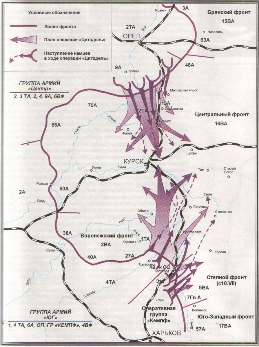 Гитлеровский план «Цитадель», одобренный в апреле 1943 года, предусматривал одновременные удары по Курской дуге с севера (из района Орла) и юга (из района Белгорода). Немецкие войска сосредоточили на Курском плацдарме около 50 дивизий (в том числе 18 танковых и моторизованных) – примерно 900 тыс. человек, 2,7 тыс. танков и более 2 тыс. самолётов. Узнав о немецкой подготовке (через расшифрованные донесения британской разведки), советское командование перешло к глубокой обороне. По воспоминаниям маршала Жукова, план советского штаба был ясен: встретить врага сплошной, глубоко эшелонированной обороной и, «измотав и обескровив» фашистов, контрударом выбить их из Курска. К началу битвы в полосе Центрального и Воронежского фронтов стояли свыше 1,3 млн солдат, около 3,3 тыс. танков и 2,7 тыс. орудий; резервный Степной фронт готовил к выходу на поле боя ещё 580 тыс. человек и 1,5 тыс. танков.