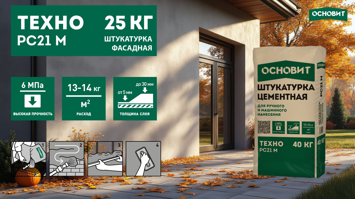 ТЕХНО PC21 M — это цементная штукатурка, которая сочетает в себе лучшие свойства традиционных и инновационных составов. Ее особенности: