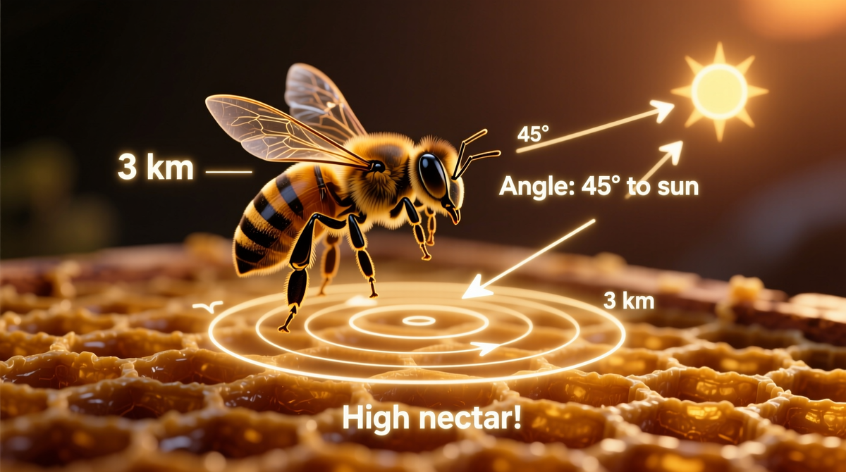 Это — научная модель передачи информации. Когда пчела находит источник нектара, она возвращается в улей и исполняет один из двух танцев: Направление - Угол прямого участка относительно вертикали = угол к солнцу Расстояние - Длительность виляния: чем дальше — тем дольше Качество - Чем энергичнее танец — тем больше нектара Это — как если бы человек вернулся и сказал: