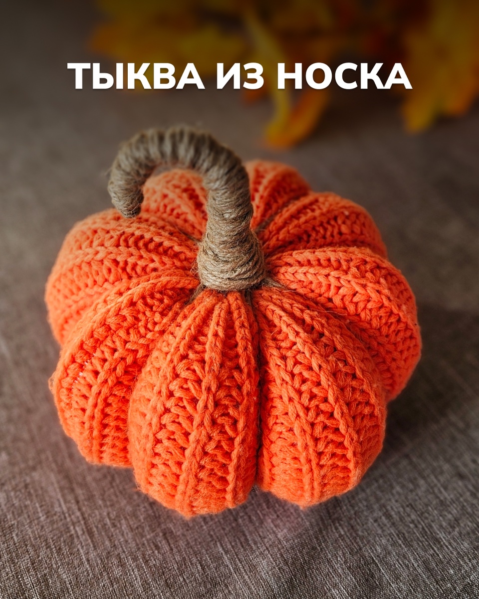 Берём ненужный толстый носок (не обязательно оранжевый – белый, серый, коричневый подойдут), или рукав от колючего свитера. У меня вот старенькая детская шапочка. Набиваем синтепоном или холоффайбером (если нет, то можно засунуть туда второй рукав/носок). Сшиваем верх (если это рукав, то и низ тоже), вставив в дырочку смотанную верёвочку или обрезки ткани – из этого смотаем хвостик. Я ещё вставила тонкую проволочку, чтобы загнуть. Обматываем набитый шар верёвочкой так, чтобы разделить на 8 секторов. Также хвостик обматываем шпагатом или полоской ткани, лентой. Атмосферная рукодельная тыква готова!