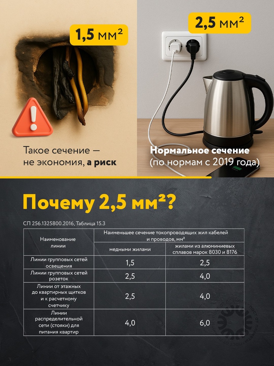 📌 Почему 2,5 мм² — не просто цифра, а ваш гарант спокойствия Выбор кабеля для розеток — не вопрос удобства. Это вопрос безопасности. По нормам с 2019 года (СП 256.1325800.2016, табл. 15.3), на розеточные линии допускается сечение минимум 2,5 мм² для меди и 4 мм² для алюминия. ❓ Зачем? Современные квартиры — это не только лампочка и телевизор. Это чайники, микроволновки, зарядные станции, ИБП и прочее. При меньшем сечении провод может не выдержать реальной нагрузки. Последствия могут быть плачевными— от перегрева до возгорания. Да, на первый взгляд разница не заметна. Но это как ездить на изношенных тормозах — до первого ЧП. 👷 Опытные электрики даже не обсуждают 1,5 мм². Это — прошлый век. 🤓 Хотите больше таких практичных разборов норм и реальных кейсов? #elektroru #ПланетаЭлектрика_вопрос_ответ #ПланетаЭлектрика_кабель