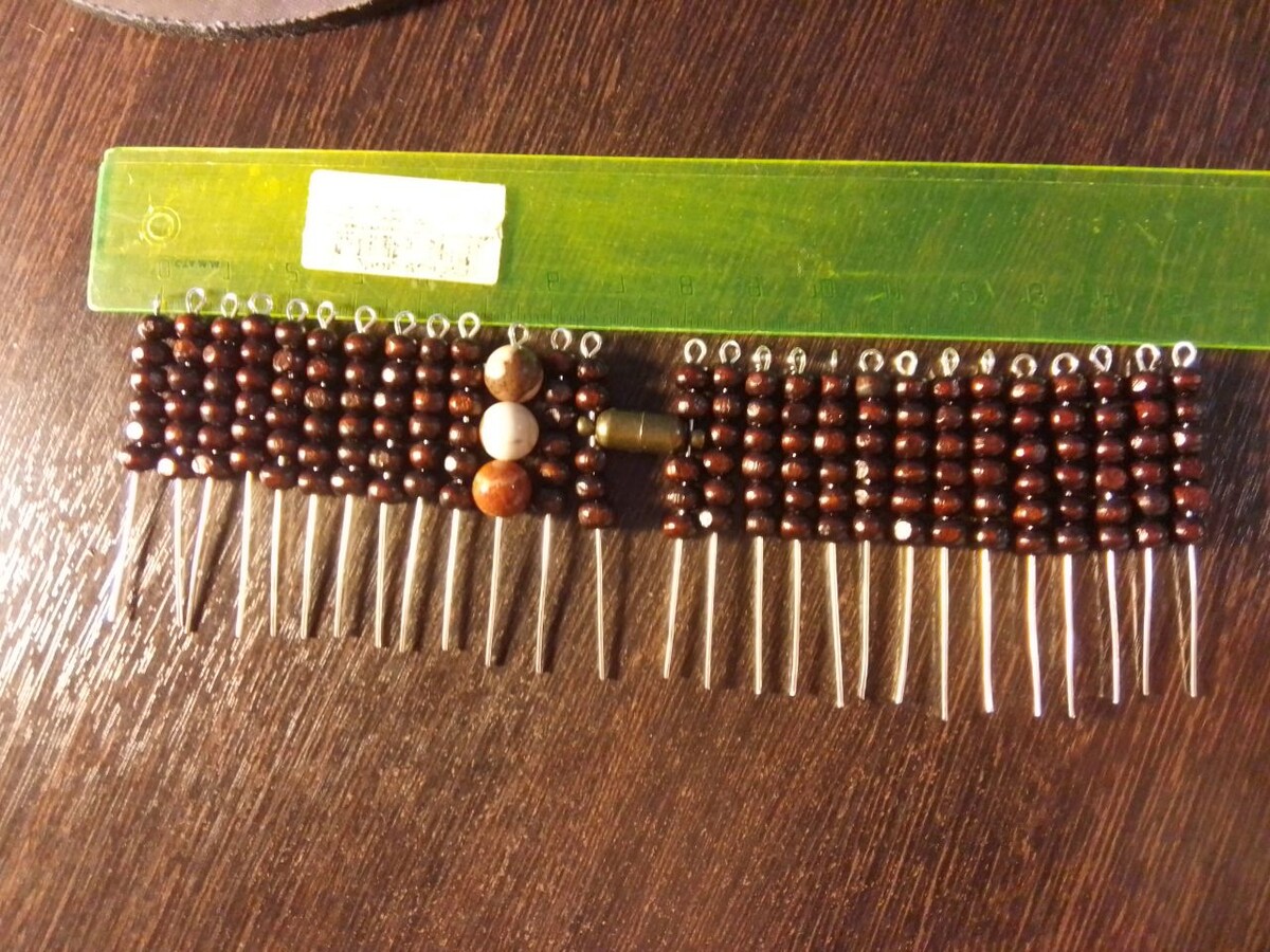 Сперва я нанизала бусины на пины, сразу добавила замочек, чтоб потом не мучиться с его креплением и чтоб замочек был плотнее к каркасу. Чтоб сделать нужную длину, я померила запястье и создала нужное кол-во заготовок. Затем я закрыла пины и получила уже рабочие заготовки После этого связала пряжей заготовки через колечки в нужном порядке, оформила края веерами и получила почти готовое изделие Вблизи это выглядело вот так. Разумеется, такой результат не годится и нужно было доделать браслет закрыв колечки пинов Для этого я связала отдельно две тесемки и пришила их тамбурным швом по обеим сторонам к пинам, закрывая их. Получился двухслойный браслет, а тесемку можно и прижать к браслету и отогнуть на внешнюю сторону для бОльшего объема Видео браслета на подиуме можно посмотреть тут