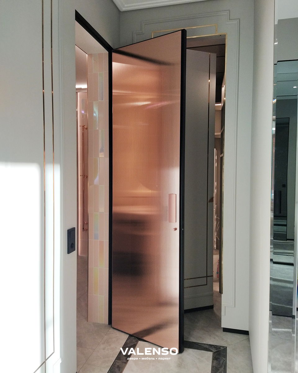 Эта дверь установлена в квартире в ЖК «5 звёзд» и ведёт в санузел. Со стороны ванной мы выполнили её из декоративного зеркала с тёплым розовым оттенком, фактура сделана при помощи сплошной алмазной гравировки, что дает изделию современный акцент. Его мягкое отражение создает иллюзию простора, красиво рассеивает свет и добавляет игривости в строгий интерьер. Ручки чешского бренда M&T, модель Konzerva, окрашены в тон стекла, что делает композицию цельной и выразительной. В конструкции использован магнитный замок, обеспечивающий плавное и бесшумное закрывание, а также сантехническая защёлка. С противоположной стороны мы сделали отделку зеркалом с чёрными матовыми ручками из той же коллекции. Благодаря этому решение выглядит элегантно и ненавязчиво, визуально увеличивая пространство и отражая свет. Зеркала для данного проекта изготовили наши партнеры студия стекла BOGEMA. На фотографиях можно увидеть, как отражения и тёплые оттенки стекла взаимодействуют с другими материалами интерьера