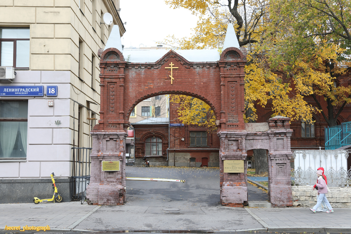 Когда идешь вдоль Ленинградского проспекта по четной стороне, сложно не обратить внимания на арку из красного кирпича с крестом, позади которой просматривается такой же краснокирпичный дом в неорусском стиле. В эту арку совершенно точно стоит заглянуть, чтобы познакомиться еще с одной страницей истории русской благотворительности. А также еще с одним параграфом Истории самой Москвы.