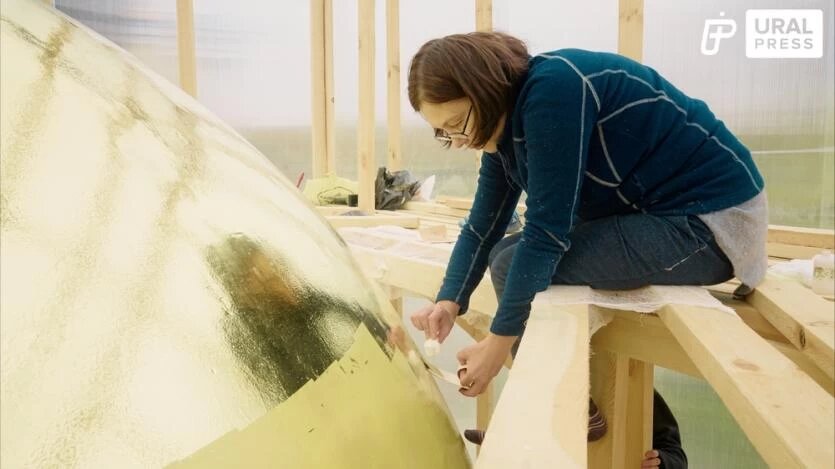 Позолотчик из Екатеринбурга Яна Василькина как раз и придает бронзовому шару завершенный вид. Работа кропотливая, но имеет свою атмосферу – пластинка за пластинкой и шар принимает тот же сверкающий оттенок, как и самый верхний купол собора Рождества Христова.