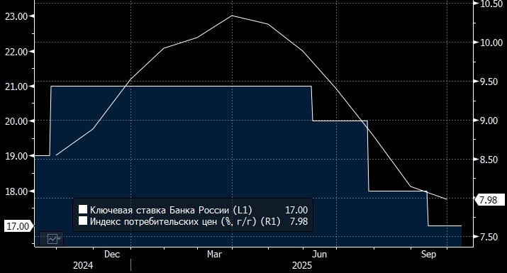 Ключевая ставка на ближайшем заседании ЦБ может быть сохранена на уровне 17% - УК "Первая" Ключевая ставка на ближайшем заседании ЦБ РФ может быть сохранена на уровне 17% годовых, если в статистике и новостном фоне не появятся признаки дезинфляции, говорится в комментарии старшего аналитика УК" Первая" Натальи Ващелюк. Эксперт обращает внимание на недельную инфляцию в период с 30 сентября по 6 октября, которая составила 0,23%, что эквивалентно 14% в пересчете на год после верхнеуровневой коррекции на сезонность. По мнению Ващелюк, недельные данные отражают лишь небольшую часть инфляционной картины, поэтому в фокусе внимания публикация итоговых данных по инфляции в сентябре и результатов их анализа Банком России. "Вербальные интервенции Банка России, как представляется, продолжают все более недвусмысленно свидетельствовать о высокой готовности регулятора снизить ключевую ставку до конца года при отсутствии значимых стоп-факторов в макростатистике и геополитике, - пишет аналитик. - При э