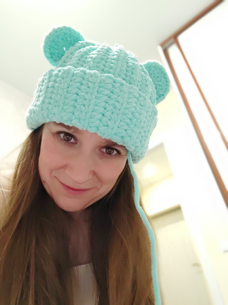 Друзья, всем привет. Увидела пряжу в «Фикс Прайсе», и так я люблю бирюзовый, не знаю, идёт он мне или нет, но как цвет обожаю просто! Купила, а что связать, не знала, увидела шапку и думаю, ну а чё, просто попробовать, и так прикольно это получилось. Мне немного не хватило пряжи на ушки, они должны были быть немного другими, ну так, ради расслабления, почему бы и нет. Классно было, я получила удовольствие. Описание нашла на Ютубе, постараюсь найти ссылку и сюда прикрепить, может быть кому-то тоже такое нравится.