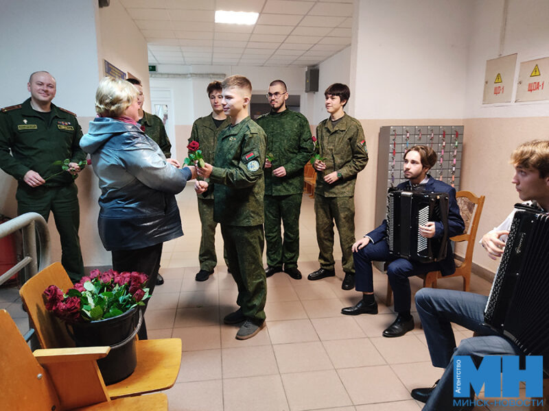 В военном комиссариате Фрунзенского района необычным способом поздравили сотрудниц с Днем матери 14 октября, передает корреспондент агентства «Минск-Новости». С утра здесь звучала живая музыка, а пришедшим на работу сотрудницам вручали цветы. Исполняли музыкальные произведения на аккордеоне и баяне учащиеся Минского государственного музыкального колледжа им. М. И. Глинки Николай Спас и Павел Дробот. Цветы дамам на входе вручали заместитель военного комиссара Фрунзенского района подполковник Сергей Жевняк и учащиеся военно-патриотического класса гимназии № 43. — Очень рада такому вниманию, — отметила мама двоих сыновей, ведущий специалист мобилизационного отдела Елена Азаренко. Ее стаж работы в военкомате — 30 лет. В военкомате Фрунзенского трудятся 48 женщин. Есть среди них и многодетные мамы — Ольга Плехова, Алеся Косаченко и Татьяна Сугако. Фото автора