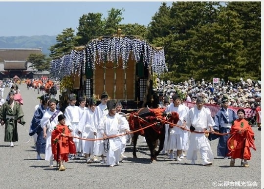 Рассказывая о Киото, мы упоминали, что в нем сохранилось много старинных праздников. Сегодня расскажем об одном из них. Аой-мацури (яп. 葵祭, «фестиваль мальвы») — синтоистский праздник, который проводится двумя составляющими святилища Камо — Камигамо (Верхний храм) и Симогамо (Нижний храм). Официальное название праздника — Камо-мацури. Своё название Фестиваль получил от листьев аой* (мальвы), которыми украшалось практически всё: святилища, императорский экипаж, одежда, головные уборы, волы и лошади. Праздник возник еще в VI в. при императоре Киммее, как способ задобрить божеств Камо. Но размах и пышность Аой-мацури получил только в Киото. Из императорской семьи выбиралась молодая незамужняя девушка, которая на время праздника становилась главной жрицей святилища — Сайо-Дай. Основной праздник состоял из двух ритуалов - Рото-но-Ги (шествие) и Шато-но-Ги (ритуал, проводимый на территории святилища). Шествие начиналось от императорского дворца. На украшенной повозке, запряженной 4-мя волами