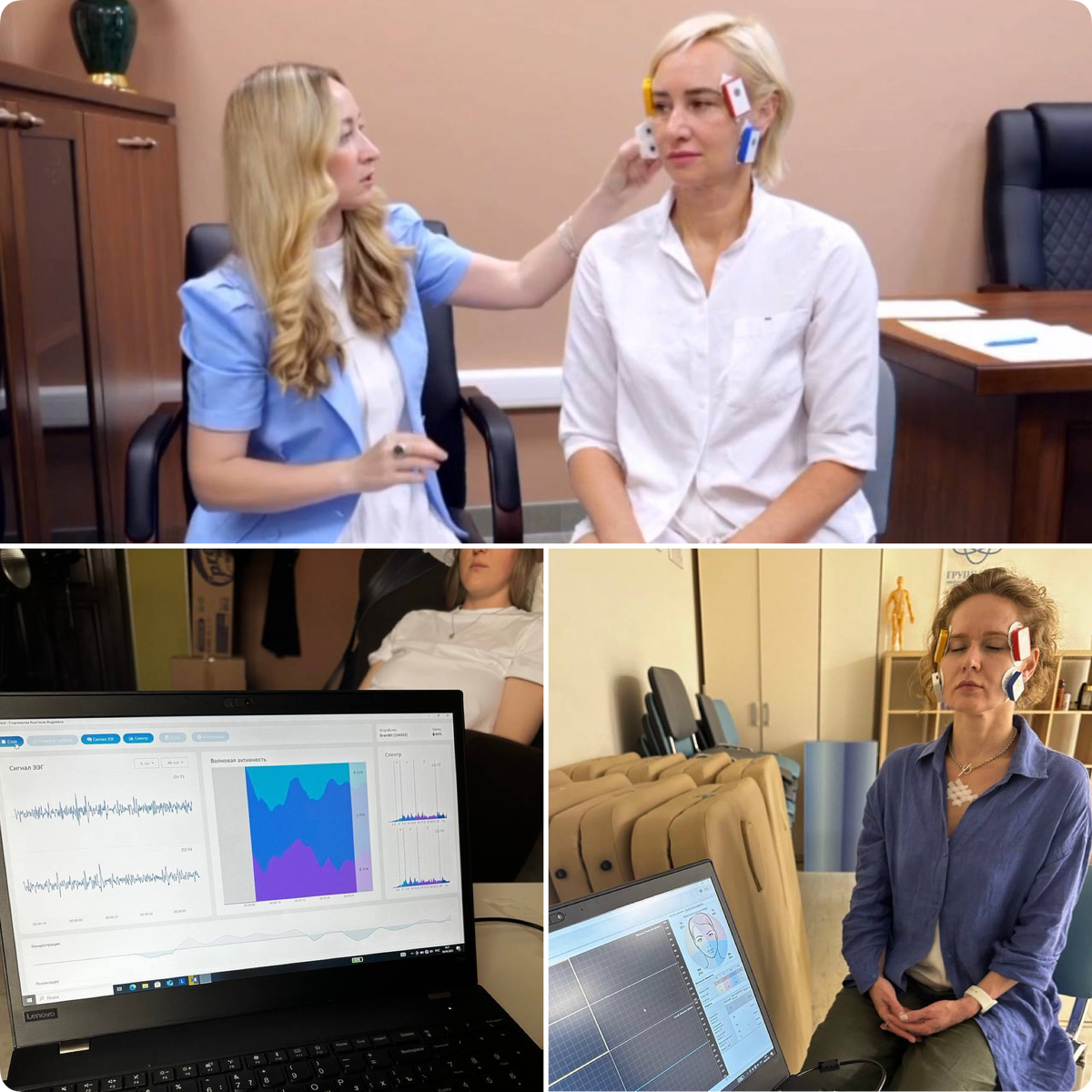 На этих фото — не эксперимент из фантастического фильма, а реальное исследование метода НейроОбаяния. Участники подключены к прибору, который фиксирует работу лицевых мышц.