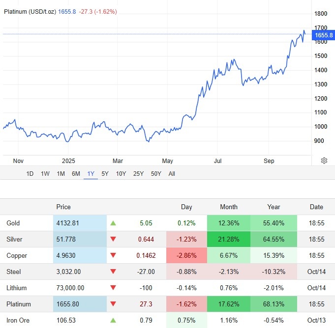 За последний месяц цена на платину выросла примерно на 16–18%, а с начала 2025 года — на 57–68% (оценки разных источников). То есть, платина по росту опережает золото и серебро. Для сравнения, в начале 2025 года цена составляла около 900–1000 USD/oz, а пиковый уровень в году достиг 1725 USD/oz.