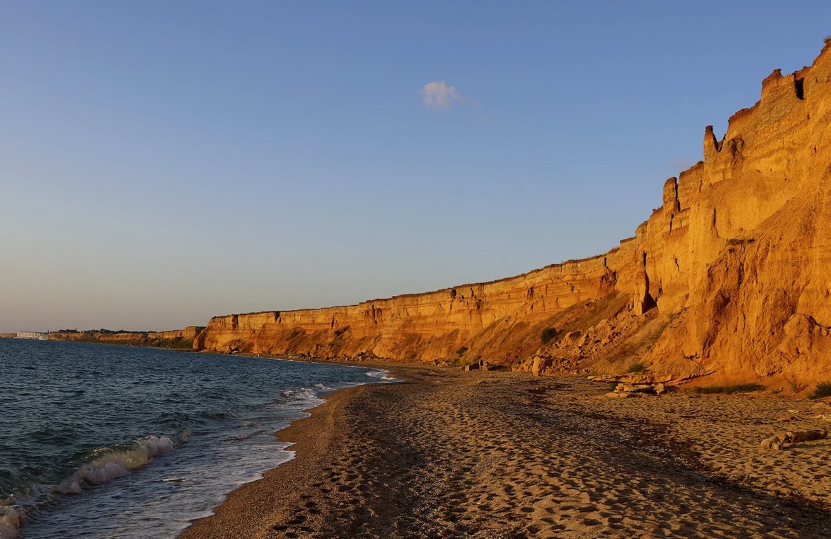 Участок побережья у села Песчаное в Крыму тянется длинной линией песка. Море здесь прогревается быстро и остаётся тёплым до осени.