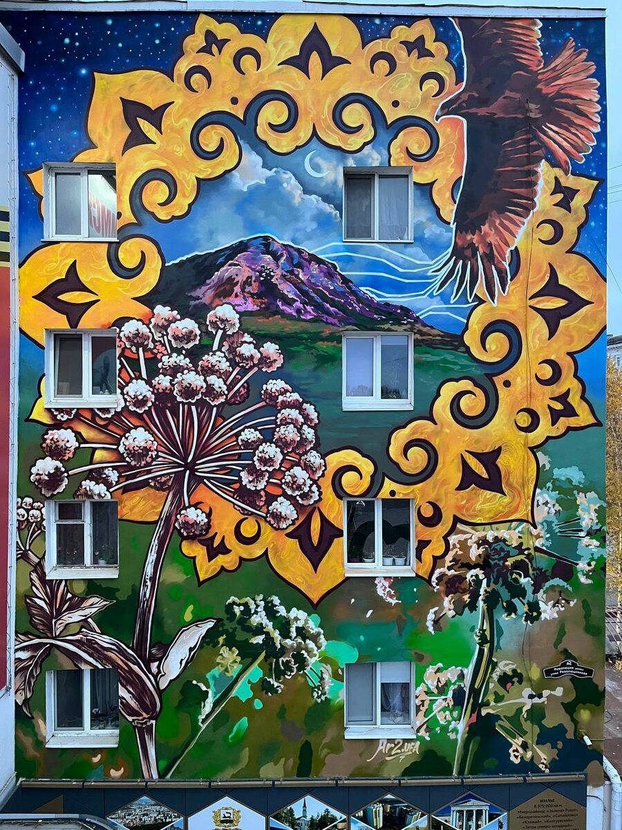 Яркое панно появилось на стене дома № 74 на улице Ленина, сообщает мэр Уфы Ратмир Мавлиев. По мнению городского главы, работа напоминает о корнях и вечных ценностях. Её авторы Артур Лукьянов и Артур Музипов изобразили на стене пятиэтажки гору, степь, парящего орла, цветущий курай в обрамлении башкирского орнамента. «В работе органично соединены главные символы Башкортостана. Эти элементы сплетаются в сложном золотом орнаменте, создавая визуальную связь между прошлым и настоящим», — написал мэр Уфы в соцсетях. Фото из аккаунта Ратмира МАВЛИЕВА.