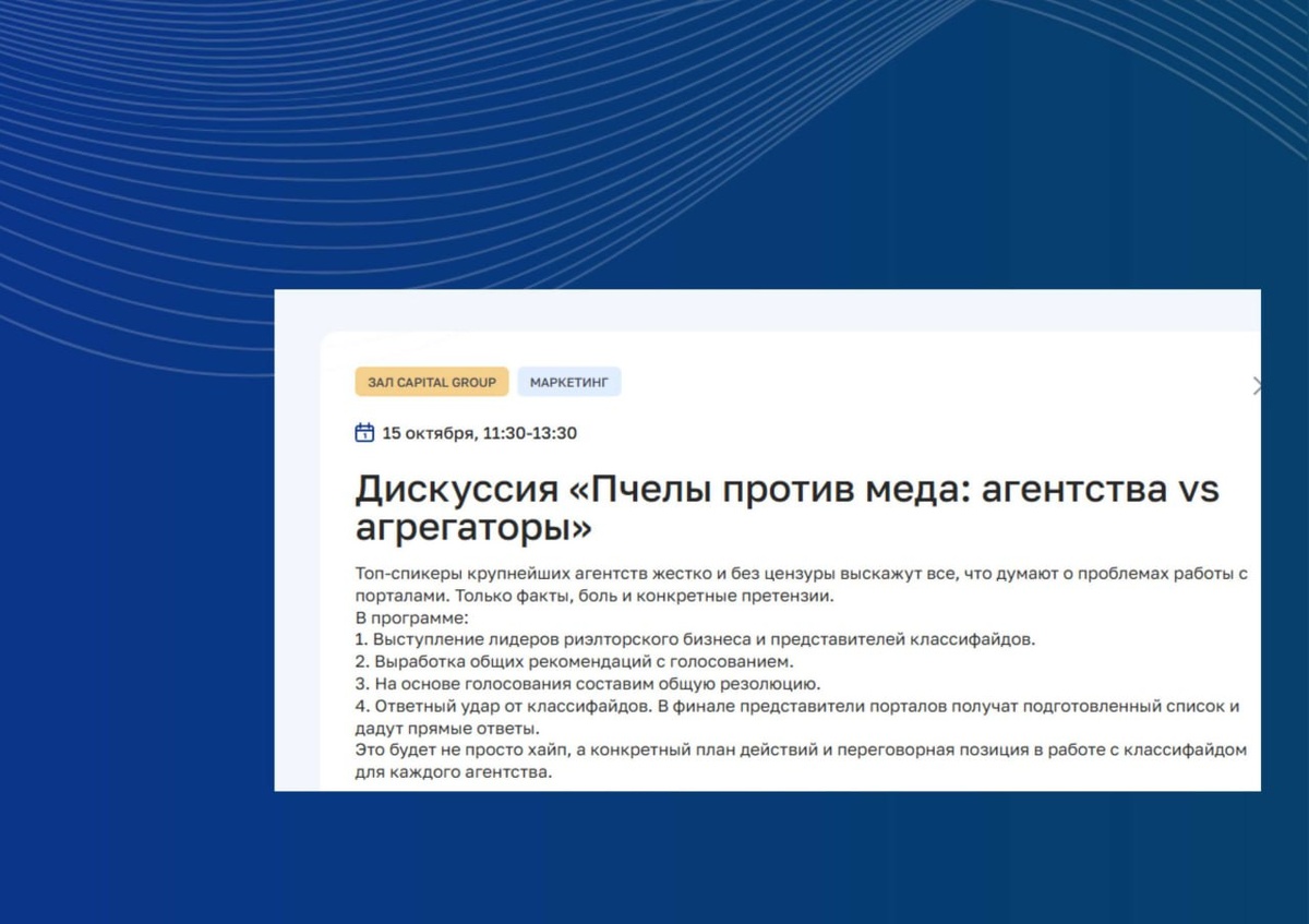 15 октября в рамках МЖК пройдет дискуссия «Пчёлы против мёда: агентства vs агрегаторы» с участием президента РГР Артемия Шурыгина. Тема взаимодействия агентств недвижимости с порталами сегодня вызывает много споров. В ходе обсуждения лидеры риэлторского бизнеса и представители классифайдов открыто обсудят существующие проблемы, обменяются позициями и предложат возможные пути решения. По итогам встречи планируется подготовить резолюцию, а также получить конкретные ответы от представителей порталов. Возможно, именно здесь будут найдены шаги к взаимопониманию и выработке единых правил взаимодействия. 🗓 Дата: 15 октября ⏱ Время: 11:30–13:30 📍 Зал: CAPITAL GROUP