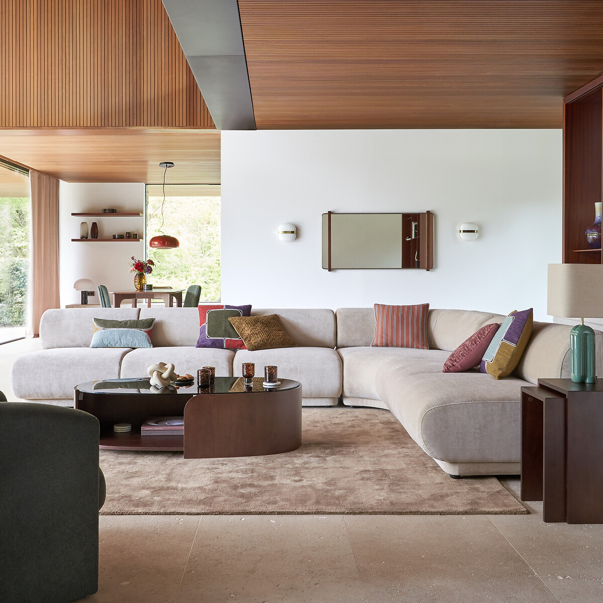 Большие диваны, кресла-качалки, пуфы и оттоманки – обязательные элементы гостиной, как правило, они обтянуты мягкими, приятными на ощупь тканями, такими как хлопок, лен или велюр. Обычно их ставят в центре помещения, а вокруг группируют остальные предметы. Корпусную мебель, которая представлена шкафами, комодами и стеллажами из натурального дерева или его качественной имитации, расставляют вдоль стен. Между предметами оставляют много места, чтобы сохранить ощущение легкости.