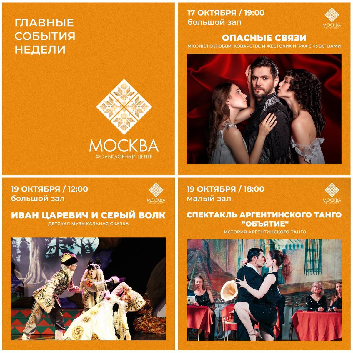 Осень в разгаре. За окном то дождь, то солнце, то ветер и тучи, но ФЦ «Москва» ждёт своих зрителей в любую погоду!🫶 Запланируйте на ближайшие выходные посмотреть легендарный мюзикл о коварстве и любви «Опасные связи», привести детей на музыкальную сказку «Иван Царевич и Серый Волк», а в воскресенье зарядиться энергией аргентинского танго на спектакле «Объятие». Билеты на сайте: https://moscowfc.ru/