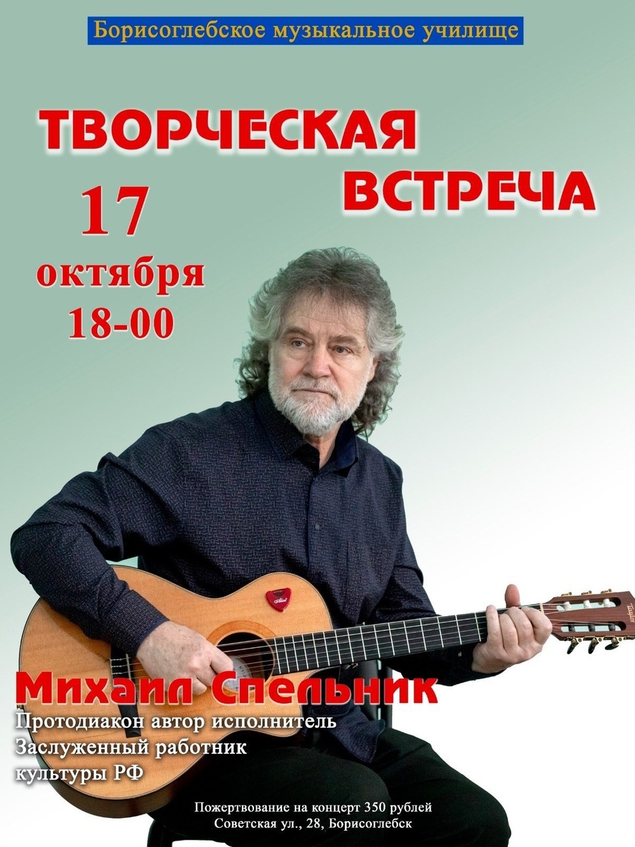 17 октября в 18:00 в Борисоглебском музыкальном училище состоится творческий вечер с Михаилом Спельником — протодиаконом, талантливым автором-исполнителем и заслуженным деятелем культуры. Приглашаются все желающие.