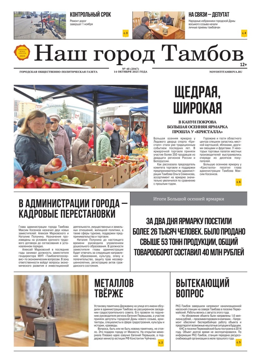 Друзья, выходит новый номер нашей газеты. В выпуске: ✍️Народные избранники гордумы начали личные приемы тамбовчан; ✅В администрации Тамбова новые кадровые назначения; 🧹Осенний месячник по благоустройству набирает обороты; 🛣Ремонт дорог завершат 1 ноября; 🛠После окончания пусконаладочных работ за тепло в МКД теперь отвечают УК; 🥨🍗🍎На Большой осенней ярмарке продали свыше 53 тонн продукции, а общий товарооборот составил 40 млн рублей; ❗️Новый памятник Державину появится на улице, носящей его имя; 🏠Проект "Пойдет погуляем": что скрыто на улице Коммунальной; 🎸Вокальный ансамбль «Русский романс» 35 лет дарит тамбовчанам радость; 🎭В ТМТ показали премьеру спектакля «Завтра была война»; 🛠РКС-Тамбов завершили капремонт КНС в поселке Первомайский; 🚲🏓Журналист НГТ расскажет, кого готовят в спортшколе №2; 🐕Горожанам напомнили правила выгула домашних животных. Эти и другие материалы вы найдете на страницах газеты «Наш город Тамбов». Ищите в киосках города, читайте на сайте novostitamb