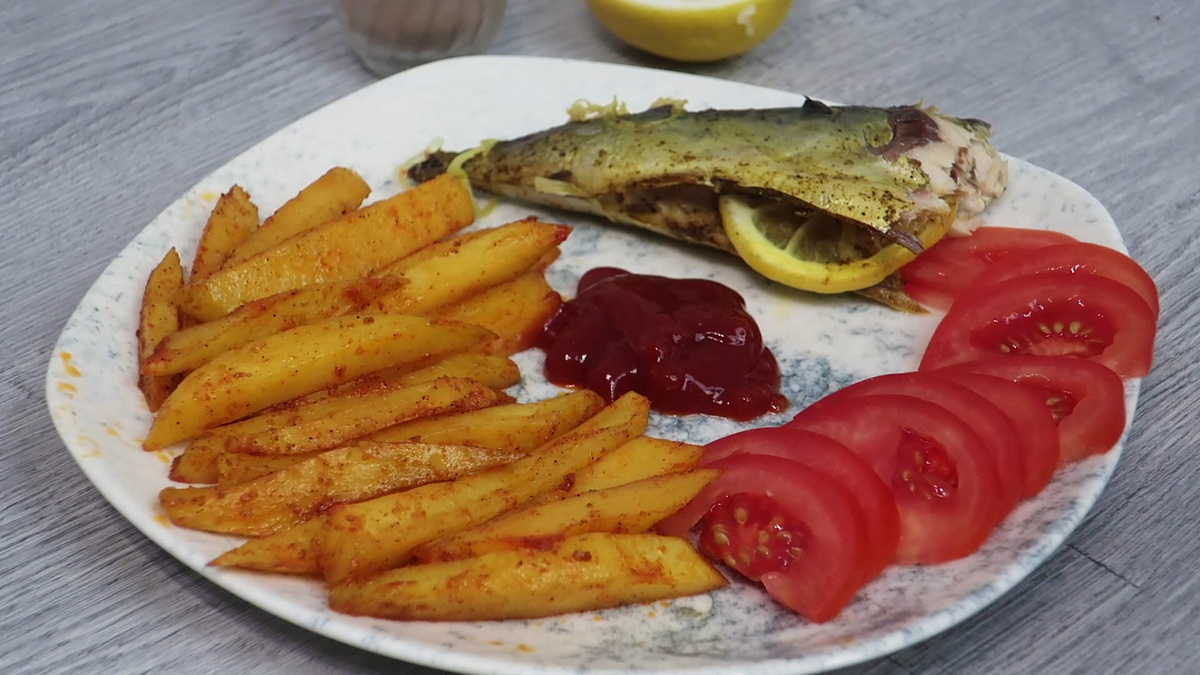 Всем привет! Спешу с вами поделиться вариантом ужина, если у вас совсем нет времени, то эта идея палочка-выручалочка. Можно взять идею и привносить что-то новое. Готовить ужин я буду в микроволновке, когда приходишь поздно домой и нет совсем времени, приходится искать такие быстрые варианты. Итак. давайте приготовим очень вкусный и быстрый ужин в микроволновке. Картофель Соль Специи Растительное масло На гарнир приготовлю картофель. Готовить картошку в микроволновке мне очень нравится, она получается рассыпчатой и очень вкусной. Картофель очищаем, нарезаем на дольки, хорошо промываем. Просушить картофель с помощью бумажного полотенца. Картофель солим, добавляем специи и немного растительного масла. Все перемешать. Картофель укладываем на тарелку и убираем в микроволновку на 10-12 минут. Мощность моей микроволновки 850 Вт. В процессе приготовления можно картофель перевернуть, но это не обязательно. Готовность проверяем зубочисткой. Рыба - 2 шт (у меня скумбрия) Лук - 1 шт Лимон - 1/2 шт