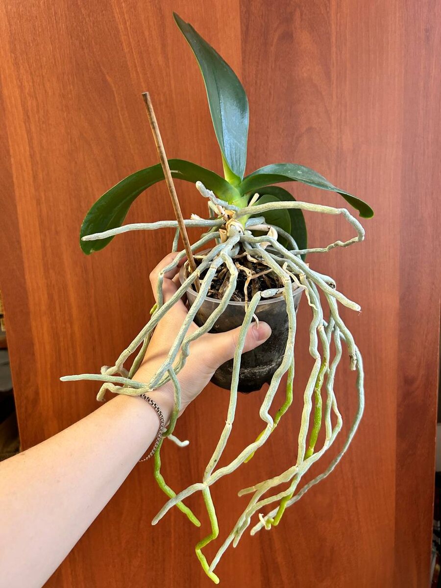 - Следить за состоянием: здоровый корень — зелёный или серебристый, упругий, сухой. Сморщенный и пустой внутри — отмерший (можно удалить).