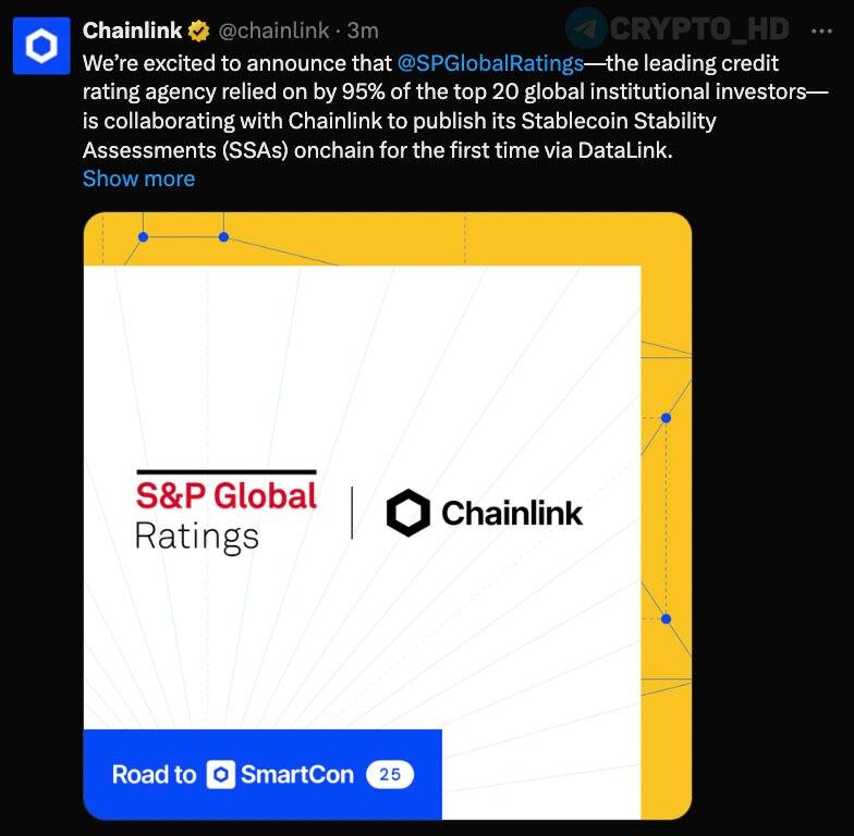 🤝 #LINK S&P Global использует блокчейн Chainlink – анонс Рейтинговой агентство S&P Global в партнерстве с Chainlink запустит Stablecoin Stability Assessments (SSA) – рейтинг стейблкоинов по способности удерживать привязку к фиату. Crypto Headlines
