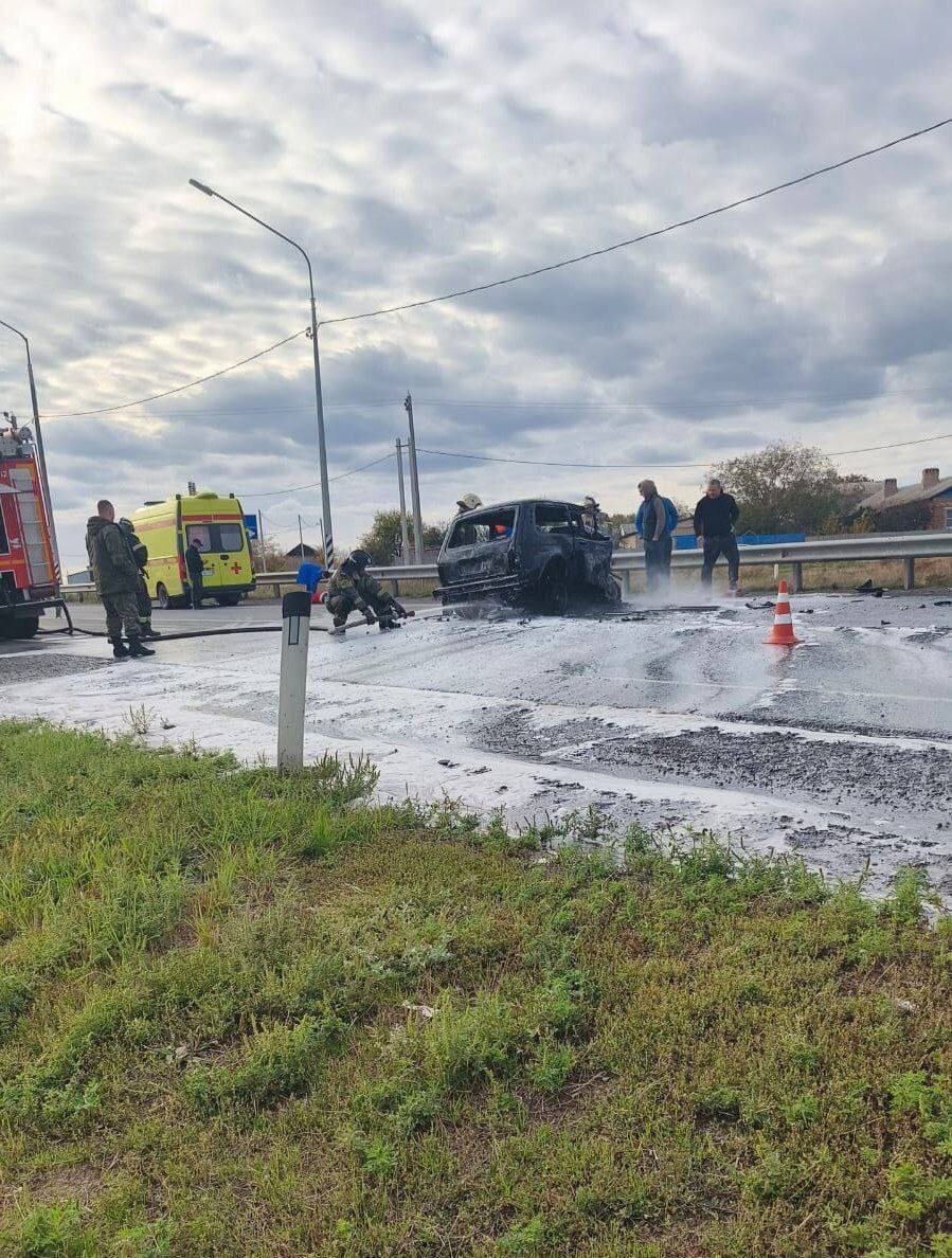 По словам очевидцев, столкнулись «Нива» и фура. От удара авто загорелось, а фура перегородила дорогу.