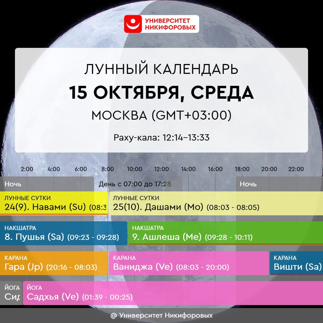 15 ОКТЯБРЯ, СРЕДА Утренние часы до 8:03 сохраняют энергетику, не способствующую новым стартам и важным делам. Последние лучше планировать на краткий промежуток с 8:03 до 9:28 – это наиболее благоприятное время этого дня, оно способно дать поддержку разнообразным начинаниям. После 9:28 включается более резкая энергия, которая дает импульс строгим видам деятельности, требующим соблюдения четких правил. Можно работать с ядами и химически активными веществами, следуя необходимой технике безопасности. Есть шанс успешно решить судебные вопросы, если таковые имеются. День может быть окрашен нотами интеллектуальной борьбы и желанием доказать свое превосходство, в том числе через использование не самых экологичных методов. Лучше направить эту энергию на изучение и исследования в интересующей вас области знаний. Вечерние часы после 20:00 несут максимальную концентрацию яда: позаботьтесь об исключении любых интоксикаций, лучше, чтобы ужин был не поздним и более легким, чем обычно.