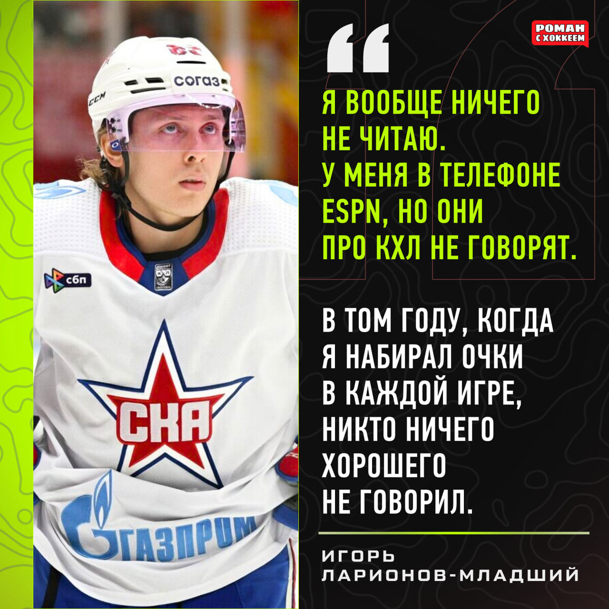 Игорь Ларионов-младший о критике: "Я вообще ничего не читаю. Я даже не знаю, где читать. У меня в телефоне ESPN, но они про КХЛ не говорят. Работа экспертов – говорить. В том году, когда я набирал очки в каждой игре, никто ничего хорошего не говорил."