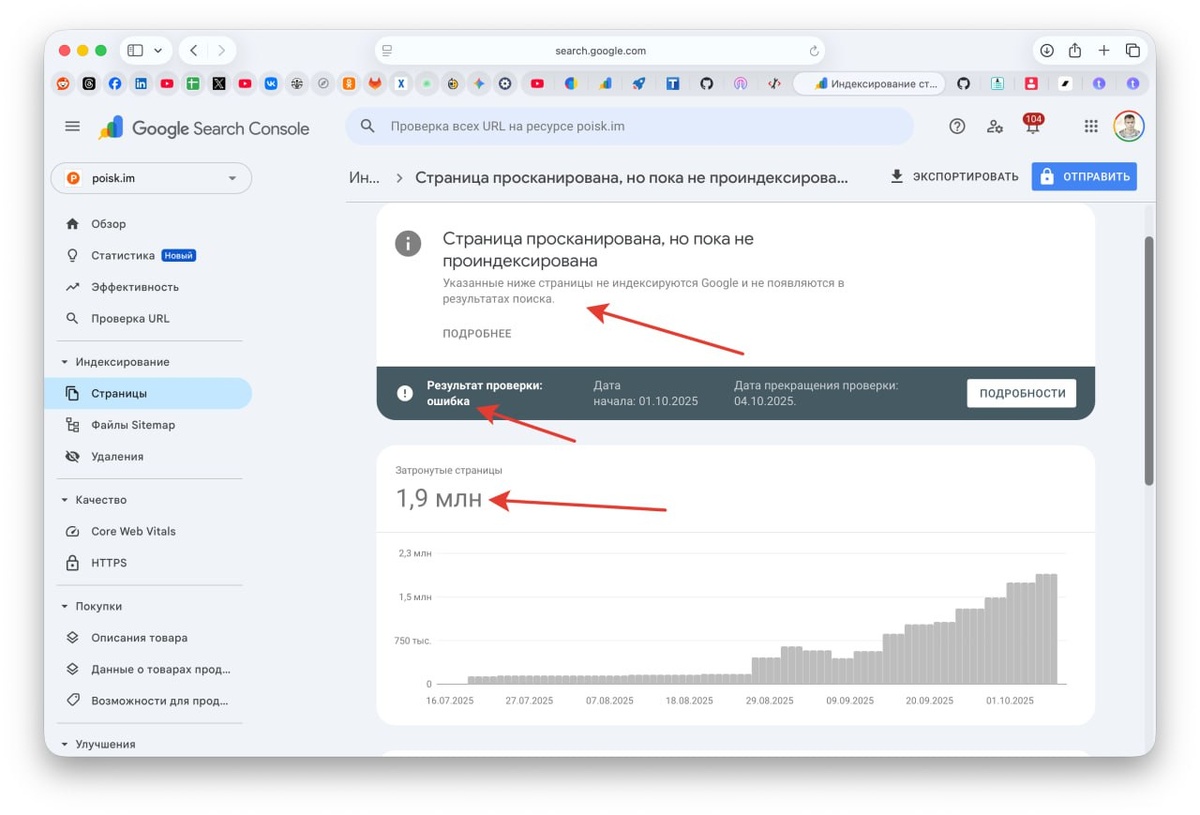 Кто может толком объяснить эту ошибку в Google Search Console? Она есть на всех наших сайтах, как не посылай на перепроверку - остается. И кажется, что это вовсе не ошибка, а просто некий долгий процесс индексации крупных проектов. Просто Google указывает мол что-то не так, устрани и попробуй заново, но я реально не понимаю :) что там можно устранить... Есть внятное логическое объяснение этому феномену? Спасибо! p.s. вот пример такой страницы https://poisk.im/p/2472062649261206144 - тут все нормик. Русский ИТ бизнес