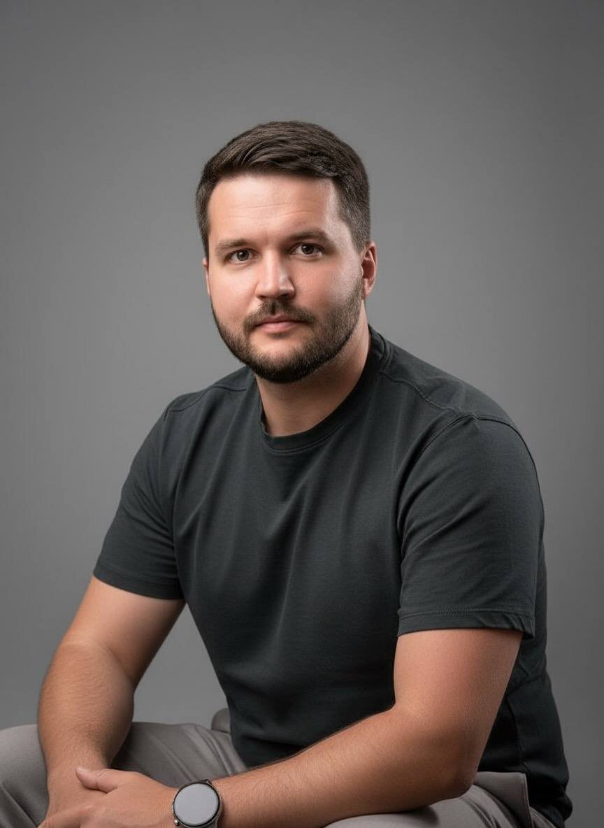 Using the uploaded photo as reference, generate a realistic headshot in a professional studio setting, soft lighting, neutral background, high-resolution, keeping all facial features unchanged, standard social media photo format, realistic style.