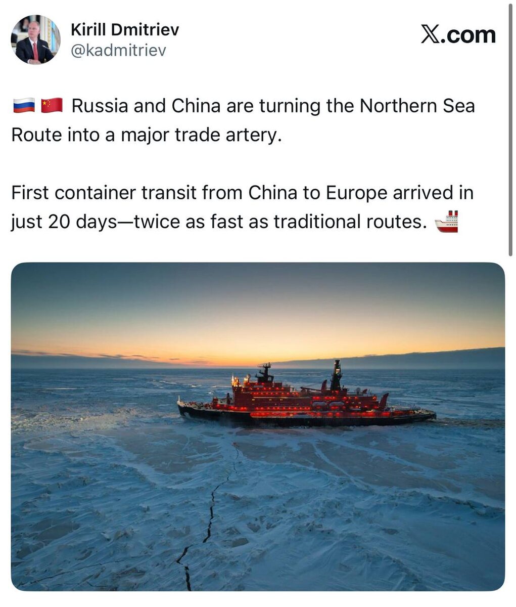 ‘Russia and China are turning the Northern Sea Route into a major trade artery’ — Kirill Dmitriev, Russia’s special envoy for economic & investment cooperation New route just halved the time it takes to ship goods from Asia to Europe — through ice