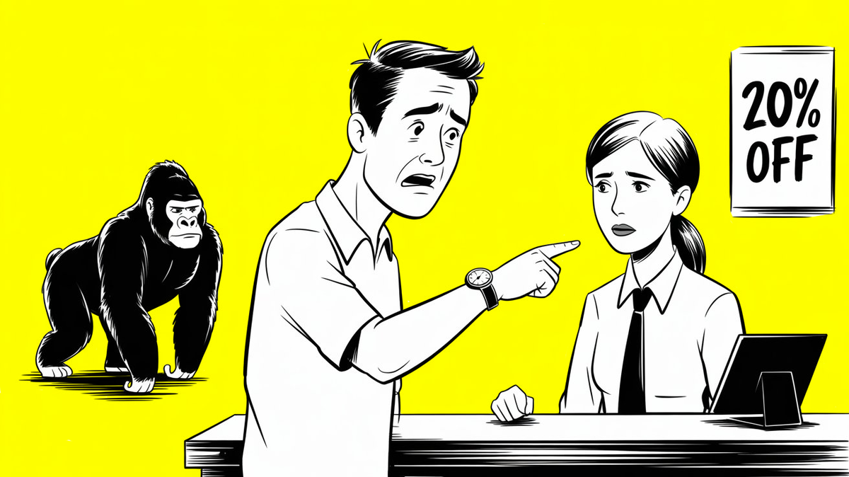Стою у стойки в хорошем, кстати, сервисе. На входе огромный баннер “-20% на работы”. Красиво. Заходит мужчина: “Ребят, у меня Qashqai, завтра ехать, масло срочно. Во сколько примете и сколько займёт?” Администратор вдохновлённо показывает акцию, перечисляет бренды масел, говорит про “консультацию технолога”. Клиент кивает… и выходит. Почему? Он считал свои пасы: время до выезда, вероятность застрять, риск ошибки. Скидка — та самая горилла: бьёт себя в грудь, но не про его задачу сейчас.