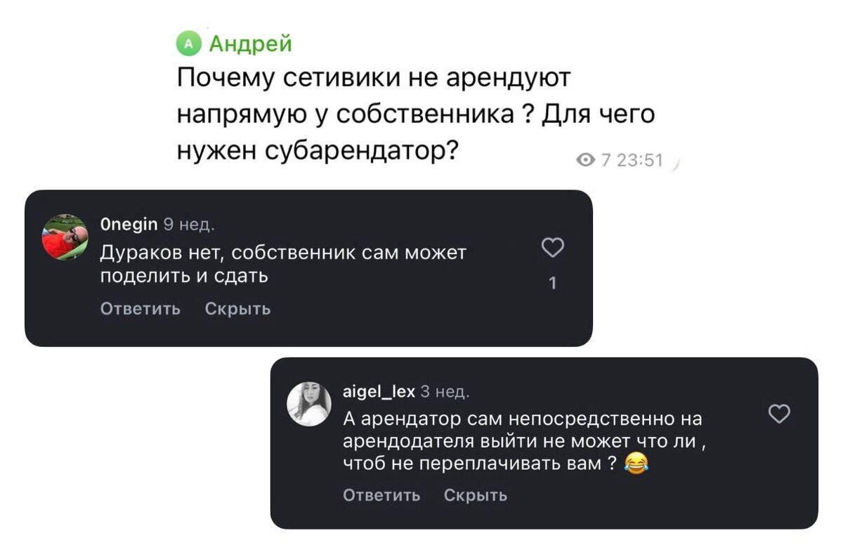 Почему и бизнесам, и собственникам нужны субарендаторы Иногда мне пишут: «А зачем вообще вы нужны? Почему сетевики не арендуют напрямую у собственников?» Или наоборот: «А зачем собственнику посредник в виде субарендатора, он же может сам сдать?» Вопросы вроде логичные. Но только на первый взгляд. Потому что и тем, и другим субарендаторы реально нужны — просто по разным причинам. Почему субарендаторы нужны сетевикам и мелким бизнесам в целом? У сетей десятки типовых помещений: похожие метражи, планировка. Им нужно готовое место под их формат. А собственник выкладывает на Авито свой голый объект 300 кв.м. И кому он такой нужен? Ни сетевикам, ни мелким бизнесам, как правило, это не подходит. Им нужно готовое небольшое помещение, куда они зайдут, сделают небольшой ремонт и будут спокойно работать. Субарендатор как раз и делает всю подготовительную работу: оценивает трафик, делит площадь, подводит коммуникации, подбирает правильных соседей по помещению — и превращает сырой объект в гот