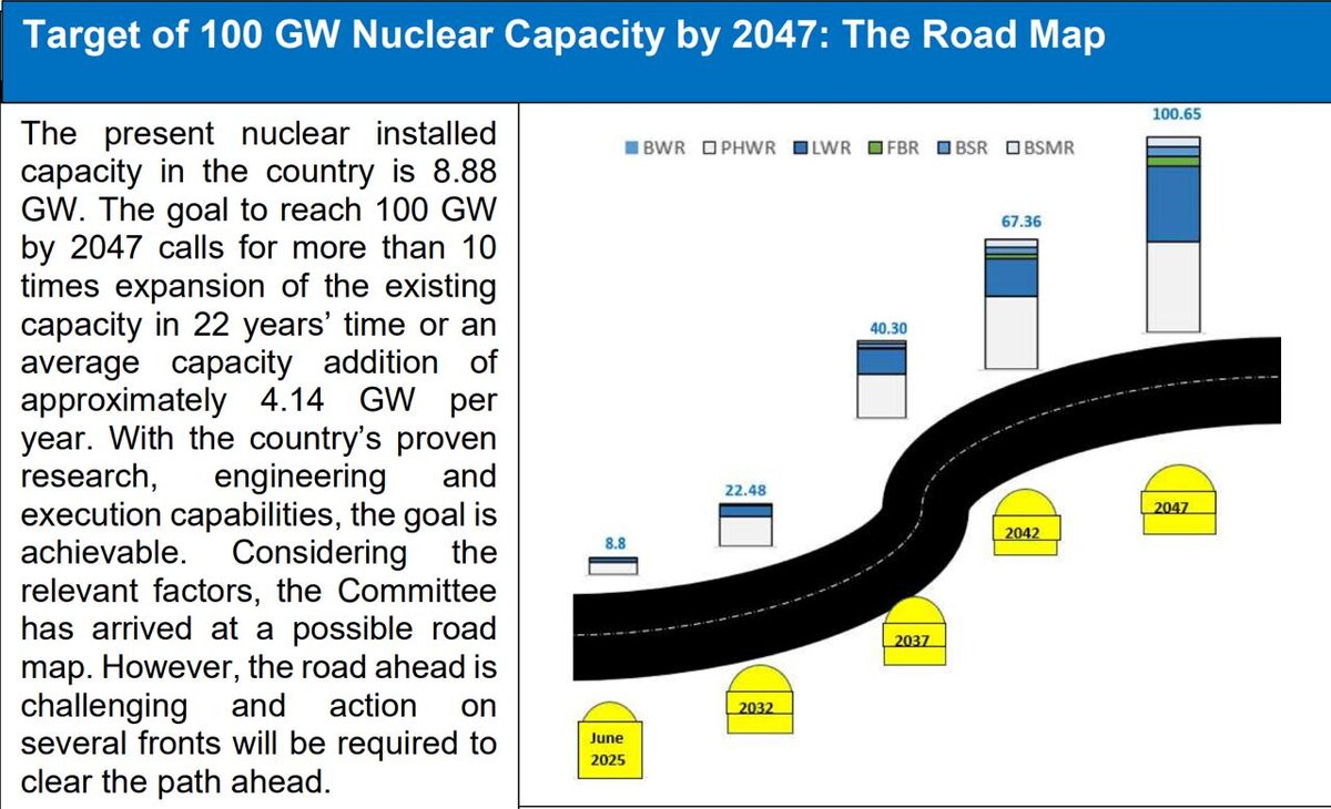 Для достижения целей Индии по совокупной мощности атомной энергетик в 100 ГВт к 2047 году потребуется порядка $217 миллиардов (в текущих ценах), говорится в опубликованном отчёте Минэнерго страны. Совокупная мощность индийских АЭС сейчас составляет 8,88 ГВт (менее 2% в энергобалансе) Чтобы преодолеть отметку в 100 ГВт к 2047 году потребуется увеличение существующих мощностей более чем в 10 раз за 22 года или на 4,14 ГВт ежегодной или минимум 3-4 полноценных энергоблока. Ранее писали, что Индия может разрешить частные инвестиции в атомную энергетику. Также отмечается, что топливо для энергоблоков ВВЭР в Куданкуламе импортируется из России. Для достижения амбициозных целей на 2047 год потребуется наращивание мощностей ядерно-топливного комплекса и работа над правительственным соглашением со странами, представляющими интерес (обладающими значительными запасами урана, например, Австралией, Монголией, Россией).