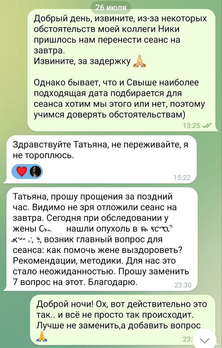Но, как видите из переписки, совсем не спроста это всё происходило, и Высшие силы намеренно задержали наш сеанс.